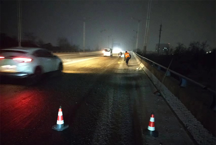 該公司除雪突擊隊由總經理徐習華和副總王利分頭帶隊指揮,集結了安全部、管養部、綠化、保潔、市政、環衛的突擊隊員80余名,出動5輛皮卡車、3輛皮卡、1臺裝載機和2輛巡查車,主要負責新區內橋梁、連云開發區橋梁、徐新路、疏港大道、228省道等主要交通干道布撒融雪劑抗凍救災工作。突擊隊員在進行融雪劑撒布作業的同時,及時清理路面融化雪水,防止再次結冰,各除雪設備配合作業,階梯式向前推進,提高除雪效率。(李敏 王宜全)
