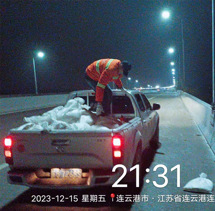 12月15日夜間21時(shí)左右,受寒潮影響,徐圩大地瞬間飄落鵝毛般雪花。為保障新城主要干道車輛、行人往來石化園區(qū)安全暢通經(jīng)過。保潔分公司結(jié)合徐圩城建與悅升公司冬季突發(fā)天氣處置預(yù)案,聞雪而動(dòng),第一時(shí)間啟動(dòng)布放融雪劑工作,大橋兩側(cè)盡顯保潔人無懼嚴(yán)寒勞動(dòng)場景。